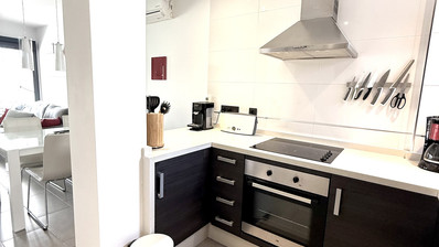 Inside, the apartment offers a modern open-plan layout with a bright living room, fully equipped kitchen, 2 bedrooms and 2 bathrooms.