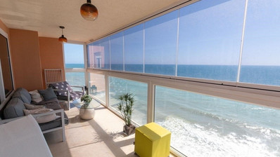 This Frontline Sea, South Facing, Three Bedroom, 9th Floor Apartment in Torrevieja, is located in an unbeatable position, right on the beachfront, offering truly spectacular panoramic views of the Mediterranean Sea. Just a two minute walk to supermarkets, bars, and restaurants, this prime location provides everything you could need right on your doorstep — and with the beach literally at your feet! The apartment features an open plan, fully fitted kitchen with a convenient breakfast bar and a utility room. The spacious lounge/dining area includes air conditioning and large sliding doors that open onto a glazed-in covered terrace where you can relax and take in the breathtaking sea views, as well as a pleasant outlook over the communal pool area. There are three double bedrooms, all featuring fitted wardrobes and air conditioning. The master bedroom benefits from an en suite shower room and direct access to a private terrace — perfect for taking in the morning sunrise over the water. A second modern shower room serves the remaining bedrooms. Situated in one of Torrevieja's most sought-after frontline locations, this apartment offers a rare opportunity to enjoy stylish coastal living with every amenity close at hand, along with the soothing sound of the sea as your daily backdrop. A truly exceptional home on the Costa Blanca South.