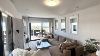 The heart of the home is the large open-plan living area, seamlessly connected to a spacious private terrace with panoramic sea views. This outdoor space is perfect for dining, entertaining, or simply relaxing while enjoying the Mediterranean climate.